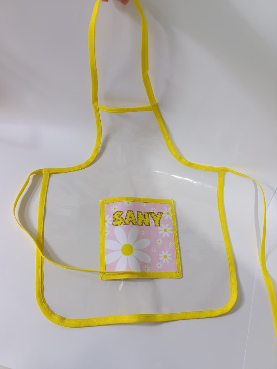 Avental infantil com tecido resistente e acabamento reforçado, ideal para proteger as roupas das crianças durante atividades na escola;